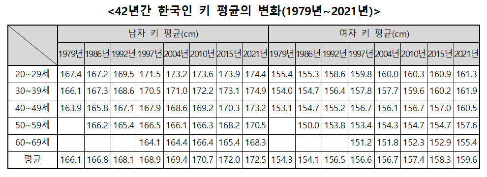 우리나라 남성의 평균 키는 꾸준히 증가해 왔습니다. 통계청과 건강보험공단 자료에 따르면, 성인 남성 평균 키는 약 173cm, 평균 몸무게는 72kg 내외입니다. 특히 20대 남성의 경우 평균 키는 174~175cm 수준으로, 전체 평균보다 약간 높은 편입니다. 이는 영양 상태의 개선, 운동 습관, 유전적인 요인 등이 복합적으로 작용한 결과로 볼 수 있습니다. 반면 40대 이후부터는 키가 조금씩 줄어들기 시작하며, 60대 이상에서는 평균 키가 170cm 이하로 떨어지는 경향을 보입니다. 몸무게는 연령 증가에 따라 조금씩 늘어나는 경향을 보입니다.