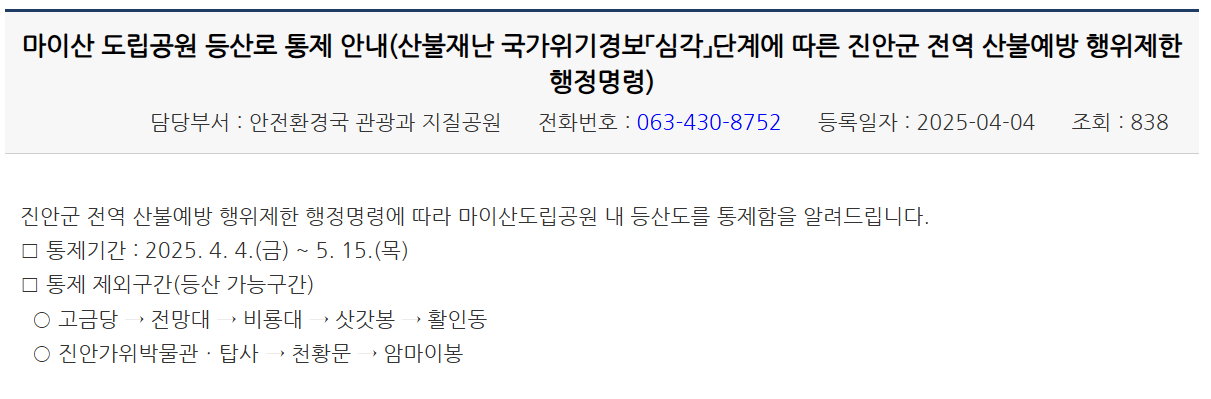 2025년 3월과 4월에 피해가 컸던 산불로 인해 산불예방차원에서 마이산도립공원 내 등산로를 통제합니다. 4월 4일부터 5월 15일까지 통제기간이며 등산이 가능한 구간은 고금당>전망대>비룡대>삿갓봉>활인동, 진안가위박물관 및 탑사>천황문>암마이봉입니다.
