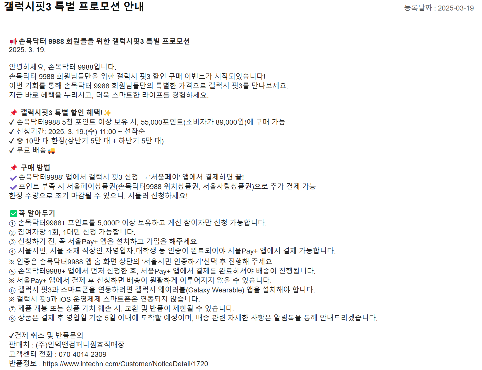 2025년부터는 손목닥터9988 참여자에게 삼성 갤럭시핏3가 지급되는데요. 단순 무상 대여 방식이 할인 구매와 포인트 결제 방식으로 전환되었습니다. 참여자가 5천포인트 이상 보유한 적립자라면 혜택을 받을 수 있는데요. 정가 89,000원 갤럭시핏3을 55,000포인트에 구매가 가능합니다. 만약 포인트가 부족하면 서울페이 상품권으로 차액을 결제할 수 있습니다.