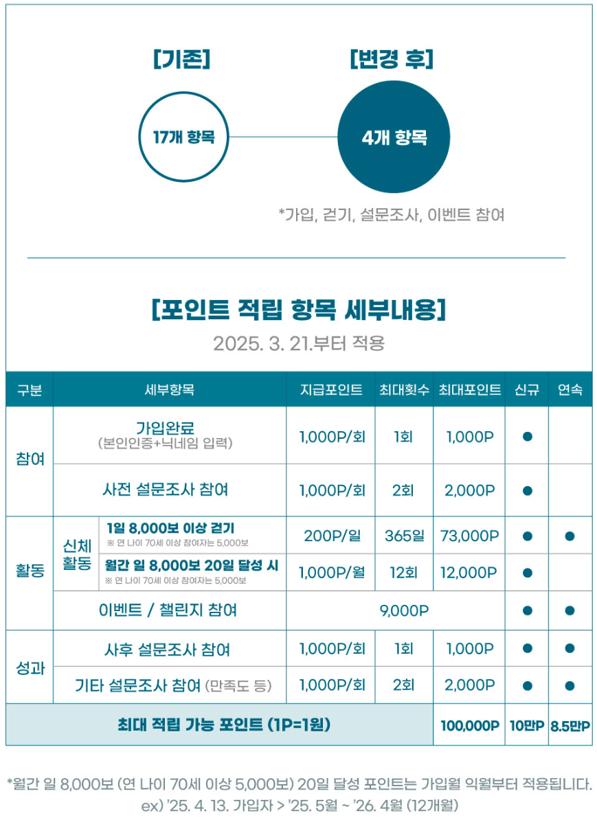 - 매월 8,000보 이상 걷기를 하면 하루에 200포인트를 얻을 수 있고 365일 즉 1년동안 73,000포인트를 적립할 수 있습니다.