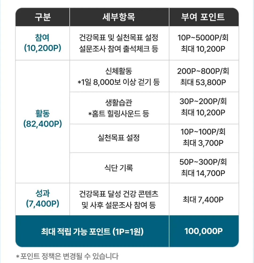 포인트는 건강미션 달성률에 따라 자동 적립되며, 모바일 앱에서 실시간으로 확인할 수 있습니다. 포인트 유효기간은 제한적일 수 있으니, 지급받은 후 빠르게 사용하는 것이 좋습니다.