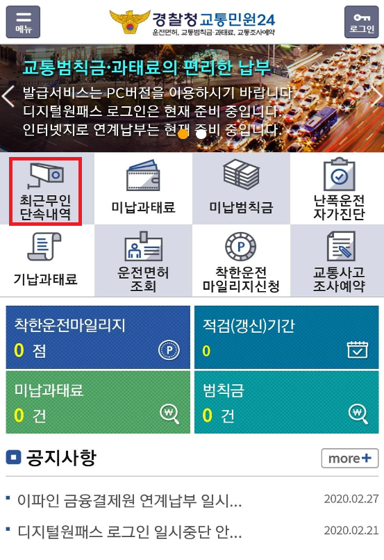 경찰청 교통민원24 이파인 홈페이지 접속한 후에 [ 최근단속내역 ]을 클릭하여 교통민원24 로그인합니다. 조회를 했을 때 내역이 없다면 위반된 것이 없다고 보시면 됩니다.