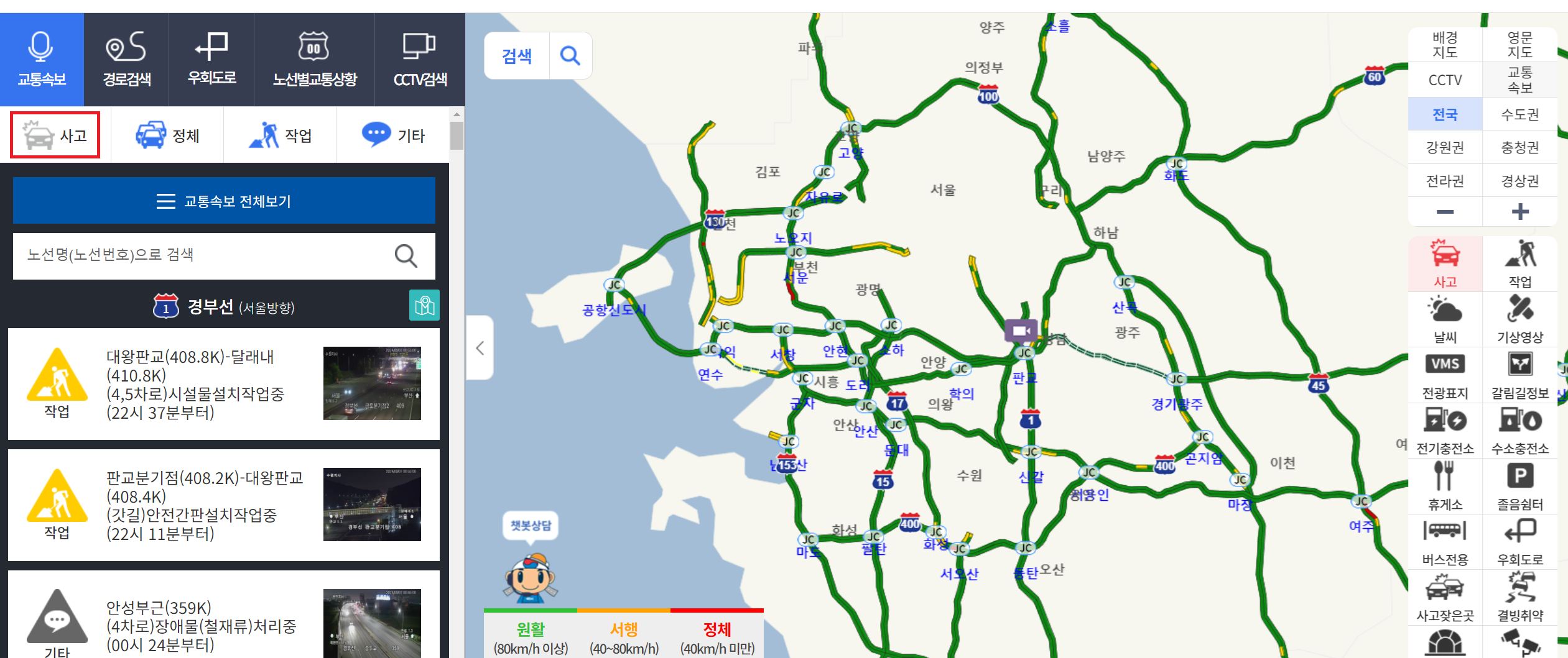 위의 캡쳐이미지는 고속도로 - 경부고속도로 클릭했을 때 화면입니다.