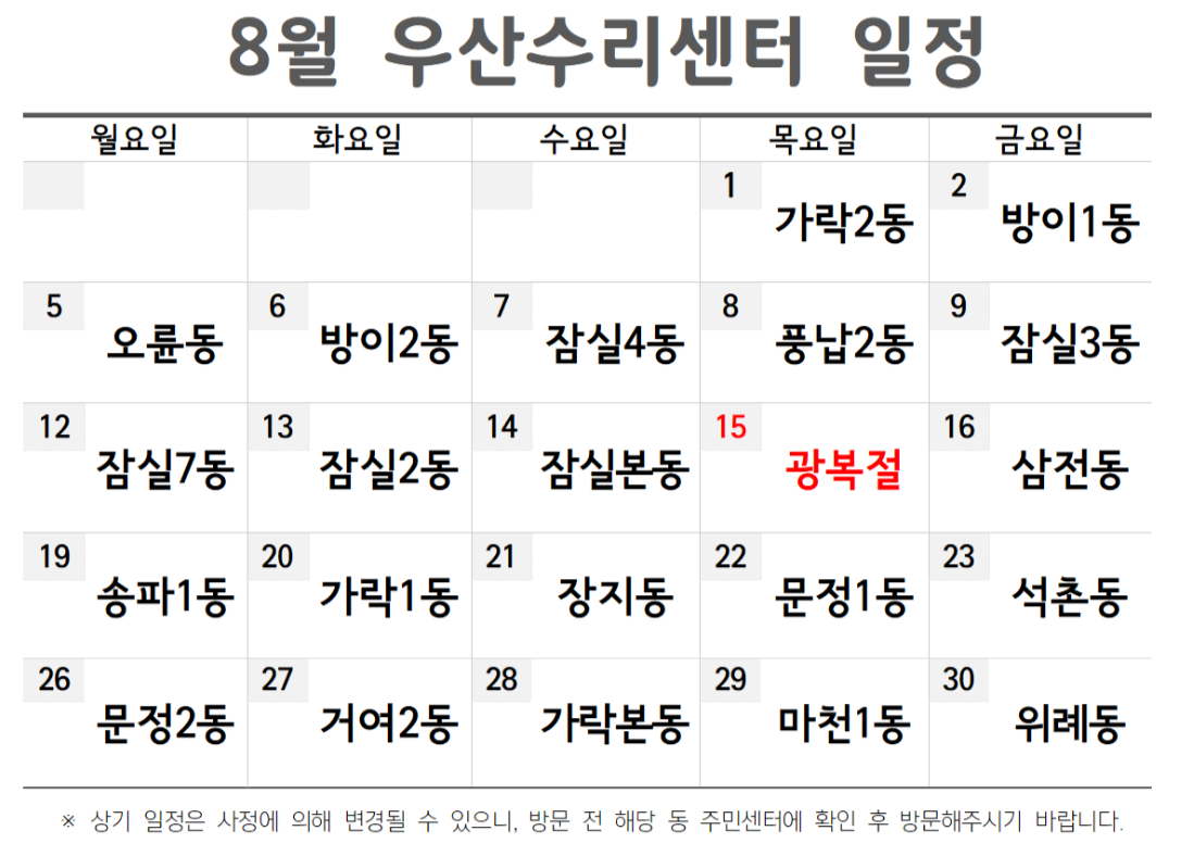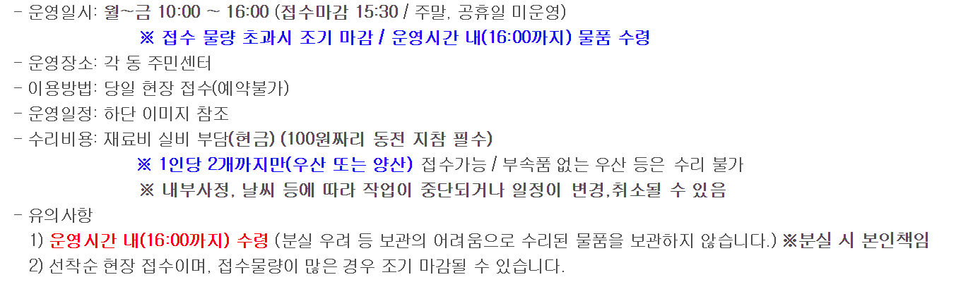 자원을 재활용하면서 주민에게 편의를 제공하고, 저소득층 일자리도 창출하자는 취지로 시작된 사업입니다. 한곳에서 고정적으로 진행하는 사업이 아니라, 지역 내 주민센터와 복지관 등을 돌아가며 찾아가는 서비스로 시행하는 사업입니다.