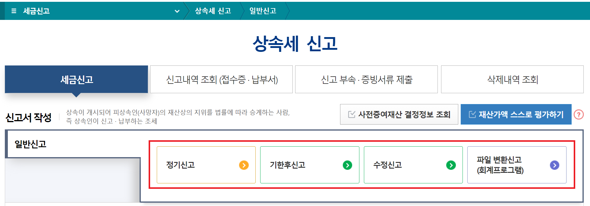홈택스 접속 > 세금신고 > 상속세 신고 > 일반 신고