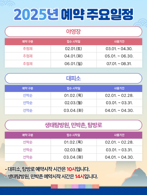 예약기간은 매달 초에 접수를 시작하며, 보통 1개월 단위로 사용기간이 정해져있습니다. 예약 시작 시간 5분전부터 예약 시스템에 접속할 수 있으며 예약 경쟁률이 매우 높습니다. 인기가 있는 대피소는 빠르게 마감될 수 있으므로 서둘러 예약하는 것이 좋습니다.