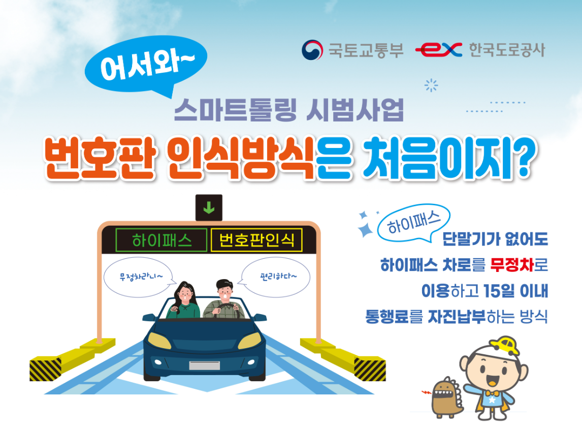 스마트톨링 시범사업을 2024년 5월 28일 14시 ~ 2025년 5월 27일까지 현재 진행중에 있습니다. 단말기 미부착 차량 또는 하이패스 단말기 고장 및 오류 차량의 경우 하이패스 차로를 무정차로 이용하고 통행료를 후불로 자진납부하는 사업입니다.