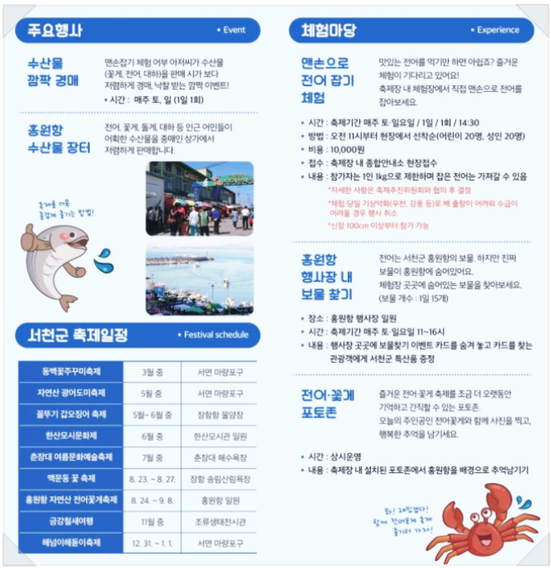 올해 제22회를 맞이하는 서천 홍원항 자연산 전어 꽃게 축제를 8월 24일부터 9월 8일까지 개최합니다. 이번 시간에는 제철 맞은 서천 홍원항 전어축제와 꽃게축제에 대해 알아보겠습니다.